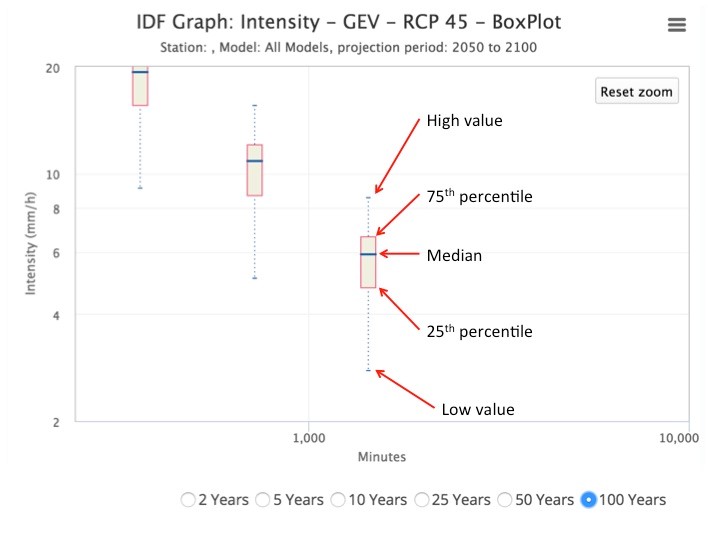 A: Users can quickly view the distribution of results produced by each of the 24 raw or 9 bias corrected GCMs datasets available in the tool by selecting the “Box Plot – Uncertainty” tab when generating future IDF curves using the “All Models” GCM option.